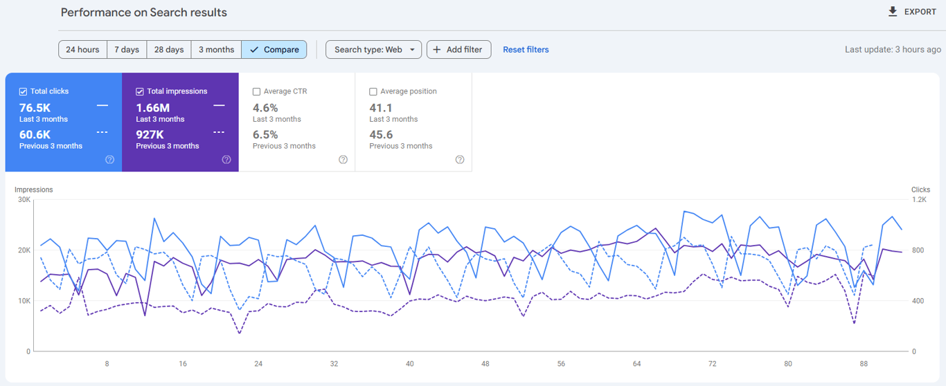👉 Result: 1.22K clicks, 73K impressions, and an average position of 9.3.